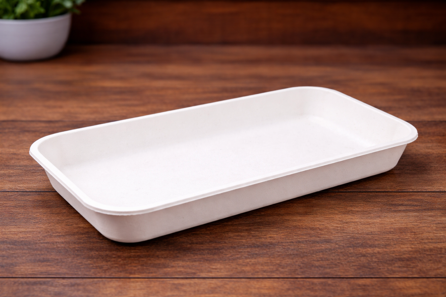 Heavy-duty bagasse trays designed for full meals, platters, and catering service. Grease-resistant and stable for transport and handling. Fully compostable, combining functionality with sustainability.