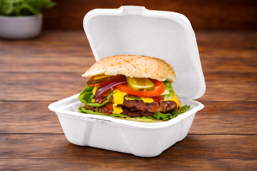 Eco-friendly bagasse burger boxes provide sturdy strength and heat resistance. Ideal for delivery and takeaway, they maintain food integrity without leaks. 100% compostable, offering a premium sustainable alternative to plastic.